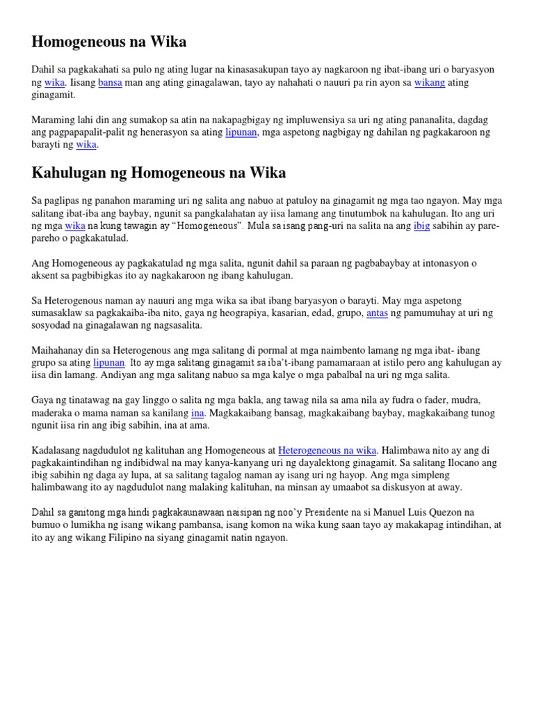 Homogeneous na wika halimbawa. Halimbawa ng homogeneous na wika. Jump to Page. Kasama pa sa ibang barayti ng wika ay pidgin creole ekolek sosyolek etnolek at register.
